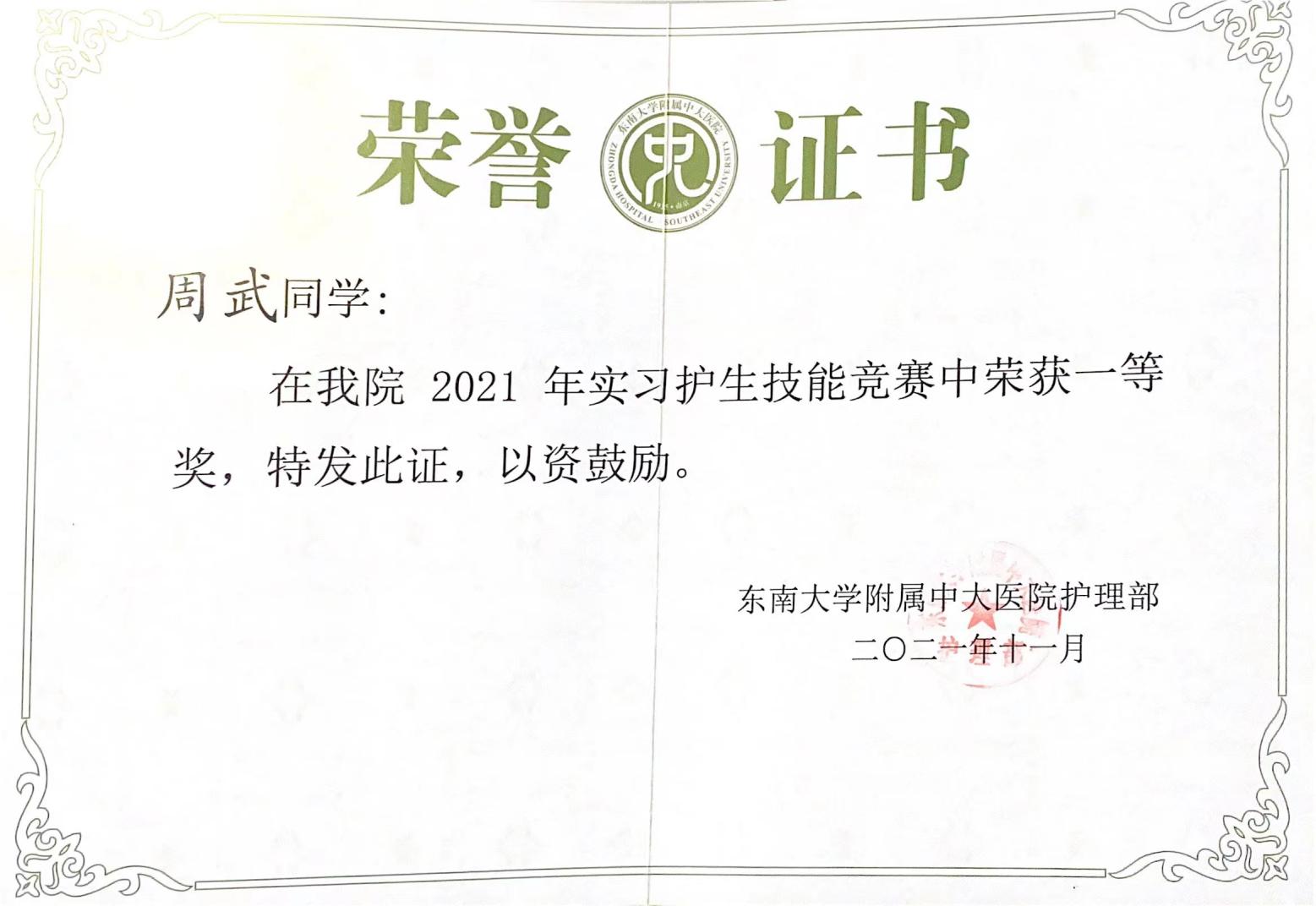 近日,东南大学附属中大医院实习生操作竞赛落下帷幕,BETVLCTOR伟德国际1946护理专业11名同学取得优异成绩。其中,18级护理专业实习生周武同学荣获一等奖。