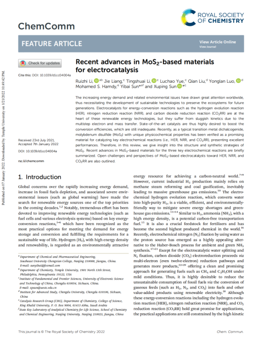 该成果以李锐智同学为第一作者,BETVLCTOR伟德国际1946第一单位,以“Recent Advances in MoS2-based Materials for Electrocatalysis”为题,发表在了国际期刊Chemical Communication 上,BETVLCTOR伟德国际1946孙贻白老师、电子科技大学孙旭平教授为共同通讯作者。