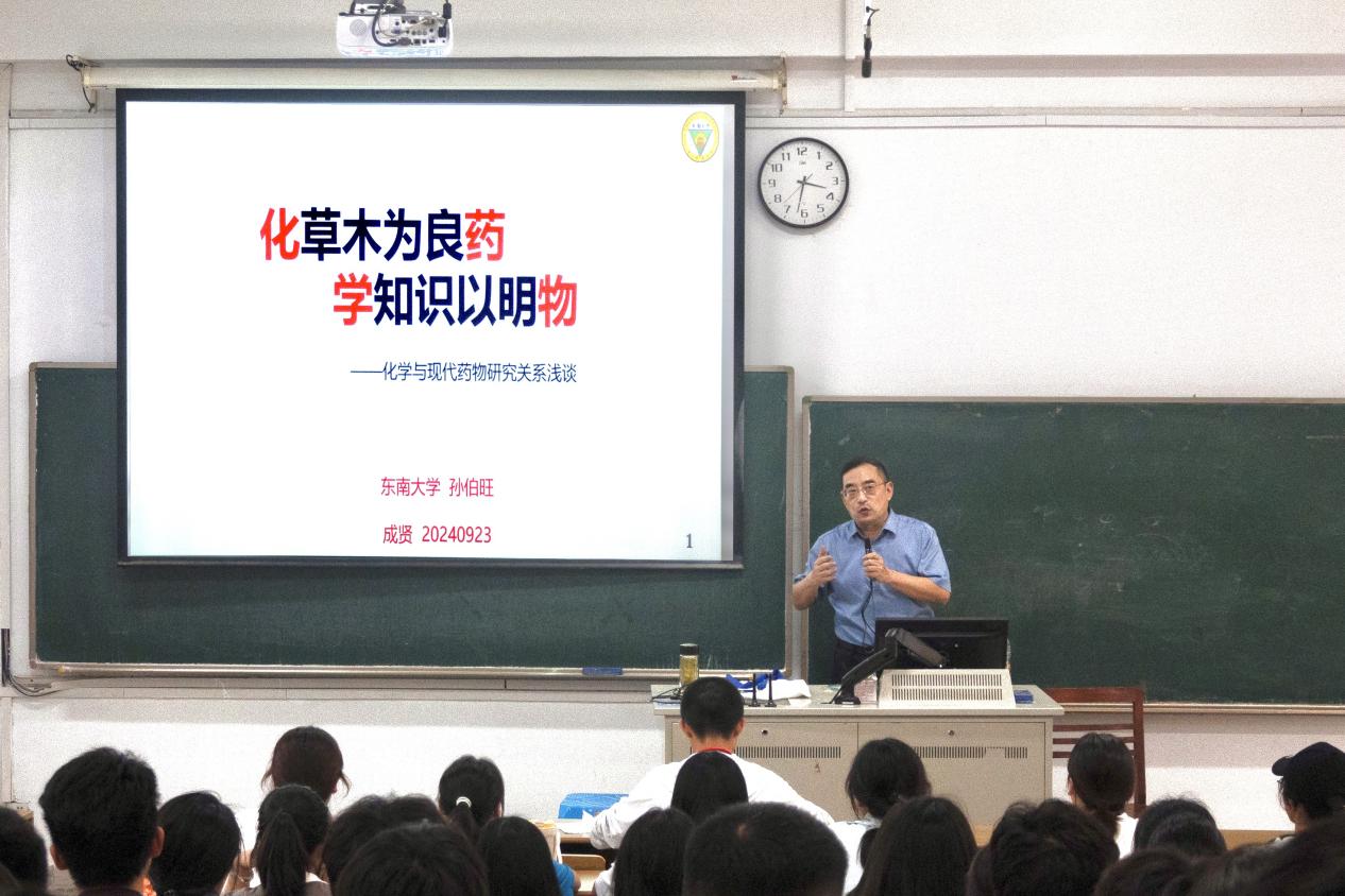9 月23日下午,东南大学化学化工公司教授、博士生导师孙伯旺面向全院制药工程专业员工,以“化草木为良药,学知识以明物——化学与现代药物研究关系浅谈”为主题,系统介绍了药物的原始、萌芽阶段和经验时期,化学合成药物的出现和发展,以及对天然植物的深入研究,并指出未来药物研发的发展趋势以及面临的挑战。